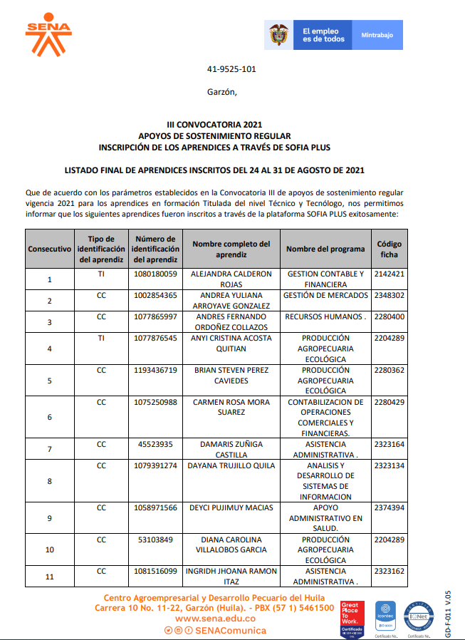 III CONVOCATORIA 2021 APOYOS DE SOSTENIMIENTO REGULAR INSCRIPCIÓN DE LOS APRENDICES A TRAVÉS DE SOFIA PLUS LISTADO FINAL DE APRENDICES INSCRITOS DEL 24 AL 31 DE AGOSTO DE 2021