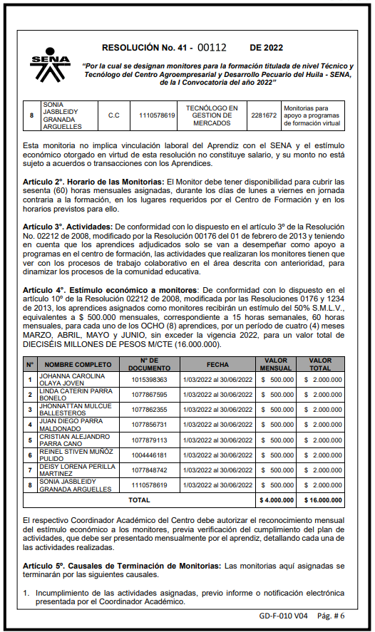 RESOLUCIÓN N° 41-00112 DE 2022 DESIGNACIÓN DE MONITORES PARA LA PRIMERA CONVOCATORIA DE LA VIGENCIA 2022